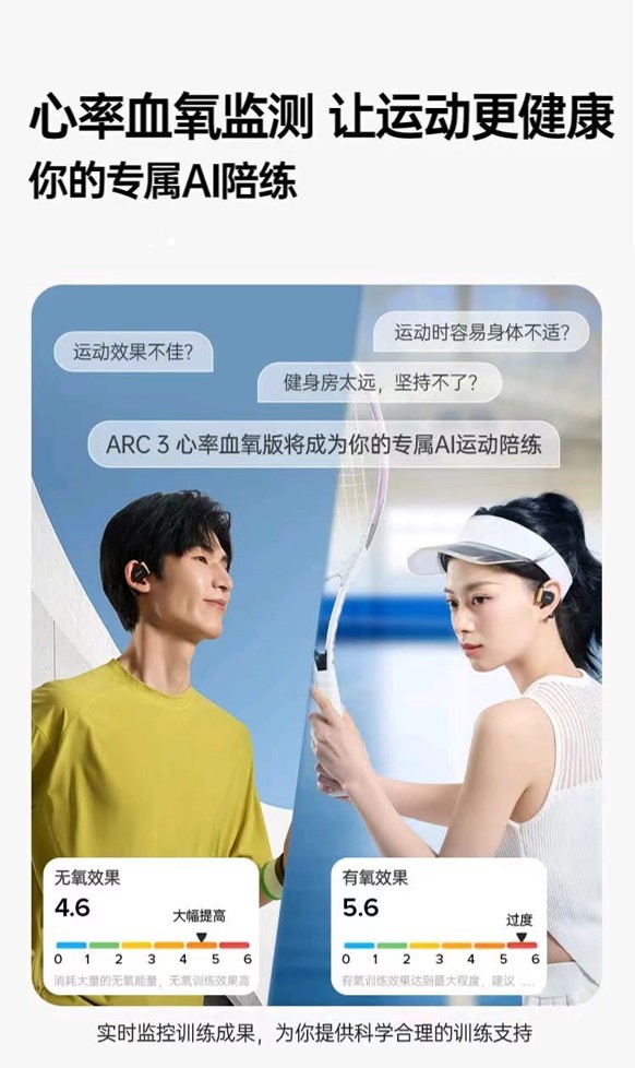 其次,ARC 3 音弧 運(yùn)動(dòng)版Pro能讓運(yùn)動(dòng)更科學(xué)、更高效。與其他開(kāi)放式運(yùn)動(dòng)耳機(jī)不同的是,它不僅創(chuàng)新性地新增了心率血氧監(jiān)測(cè)這一功能,更是搭配了一系列運(yùn)動(dòng)健康服務(wù)。