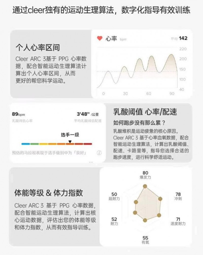 Cleer與全球頂尖專(zhuān)業(yè)運(yùn)動(dòng)科學(xué)及AI智能教練服務(wù)商——GoMore緊密合作,共同為ARC 3 音弧 運(yùn)動(dòng)版Pro搭載了包括個(gè)性化心率區(qū)間、有氧關(guān)鍵指標(biāo)、能量消耗等一系列綜合性算法。不僅有助于準(zhǔn)確評(píng)估運(yùn)動(dòng)能力,還能實(shí)時(shí)監(jiān)測(cè)訓(xùn)練成效,為用戶(hù)提供更加科學(xué)合理的訓(xùn)練計(jì)劃。